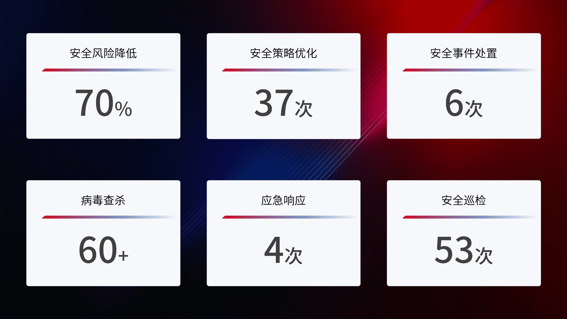 提供全面的安全事件报告体系,,包括处置报告、、、、周报、、季度和年度总结,,,,结合持续监控,,帮助客户深入了解网络安全状况。。。