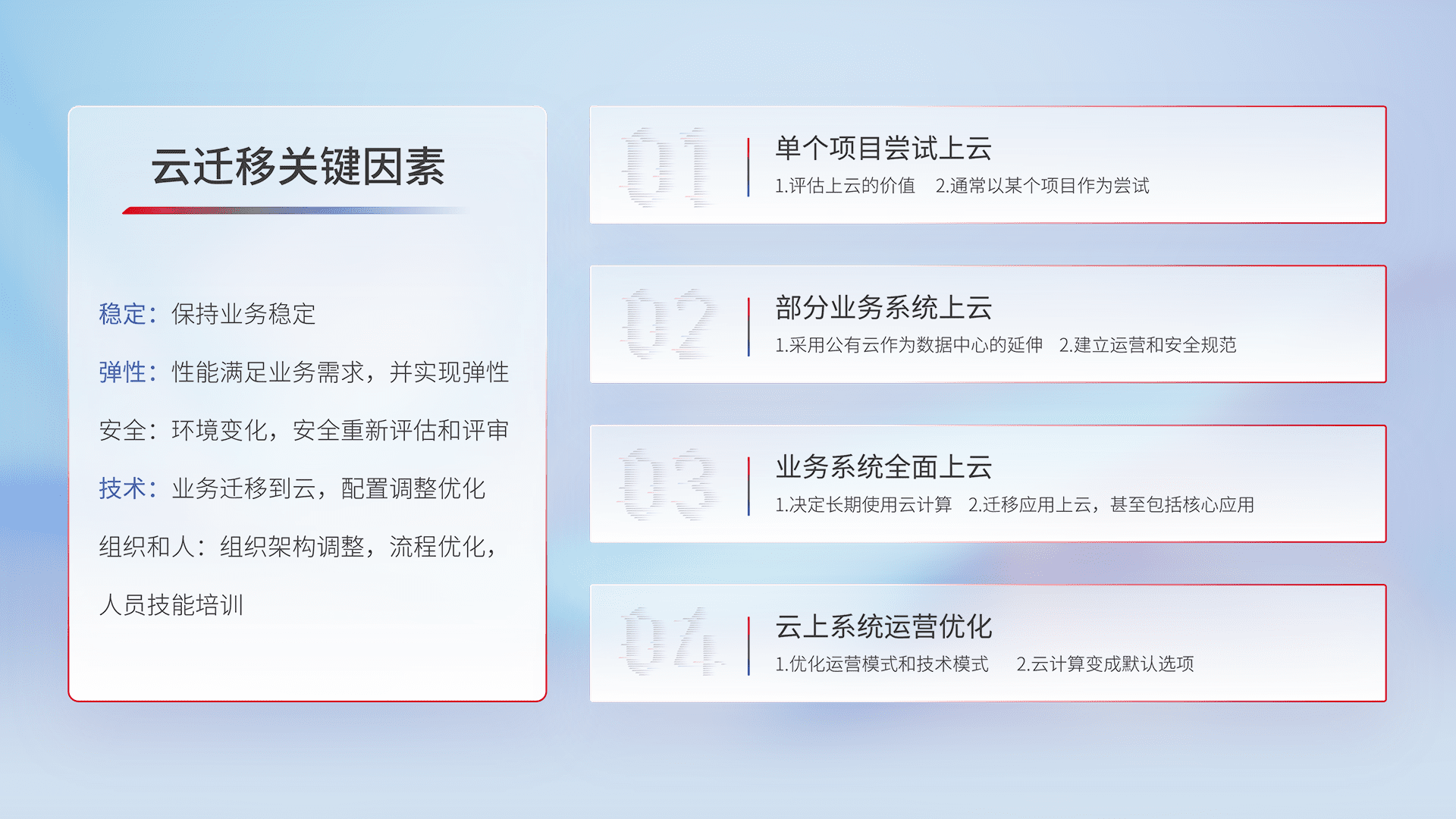 结合实际业务,,,,从规划设计、、、云平台选型、、、云原生改造、、数据迁移、、、、集成交付,,,,迁移全过程为客户识别最佳上云路径,,做好风险识别管理,,,,设计网络架构、、身份权限、、安全审计合规、、操作审计、、、日志审计、、、、监控告警策略、、、、多站点容灾设计等,,,对云上基础设施进行整体规划,,,,提升IT治理水平,,,,以满足弹性、、、高可用、、、、高性能的需求。。