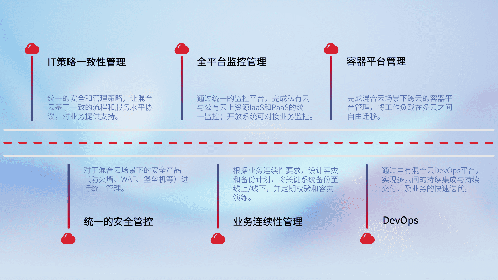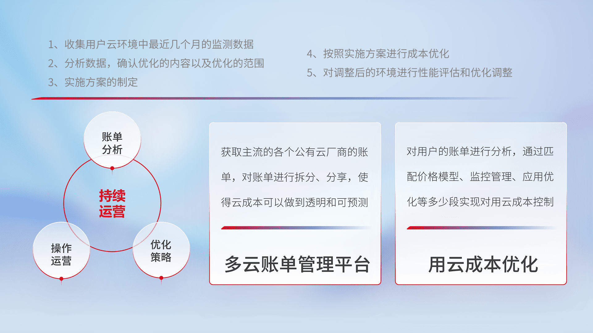 通过多云纳管,,以统一的资源数据模型把客户的云资源进行抽象和封装,,进而实现对多云资源的统一操作,,,保障云资源管理的可靠性、、、稳定性与可用性。。量身定制化运维内容,,,,配置、、开发运维、、补丁管理、、、备份、、、、监控、、认证和访问管理、、、、审计和日常巡检等,,保障在用云过程中的可靠度,,,稳定度以及高可用率。。。